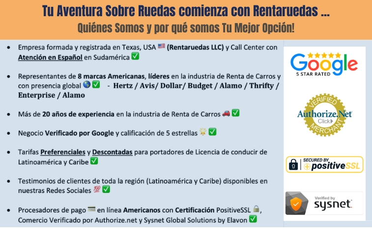 Rentaruedas.com es administrado por Rentaruedas LLC (Texas, USA); representante y broker de las marcas líderes en alquiler de vehículos a nivel global. Con más de 20 años de experiencia en la industria y con un moderno motor de reservas, desde www.rentaruedas.com podrás Cotizar, Reservar y Pagar tu servicio de alquiler de carros alrededor del mundo.