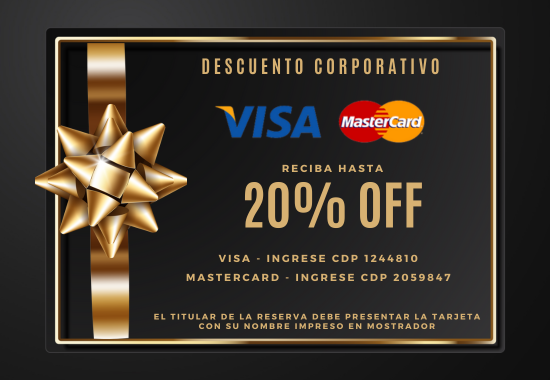 Requisito: Presentar la tarjeta de crédito VISA o MASTERCARD en mostrador. Se verificará que el nombre en la tarjeta sea el mismo que el nombre del titular de la reserva de alquiler y se utilizará la tarjeta para la retención de garantía. La presentación de la tarjeta de crédito y la retención son totalmente independientes a la forma de pago del servicio que se realiza antes del viaje, misma que puede ser con tarjeta, por transferencia o en efectivo sin afectar el Descuento Corporativo.